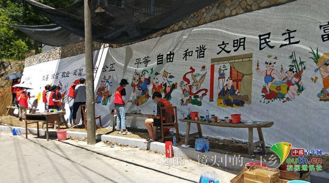 中国青年网福州9月2日电(通讯员 汪莹)在闽清坂东镇和梅溪镇的各村街道两旁的墙壁,被红色主题墙绘所填满,原本毫无生气的墙体,不仅被一幅幅绘画作品赋予了“生机”,也向人们直观地展现了主题艺术墙绘所蕴含的文化,这成为了村里一道道靓丽的风景线。这是来自 8x8x 的大学生们在暑假期间完成的。