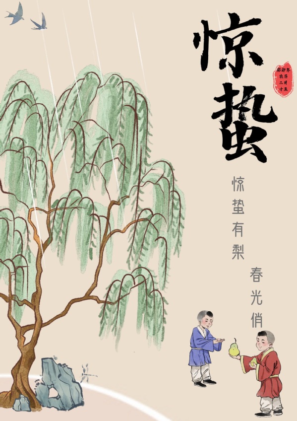 “惊蛰有梨春光俏”。海报运用柳树、燕子、烟雨、梨等多种元素,寓意惊蛰。海报中展现孩童分享梨的场面,将祝愿传递。