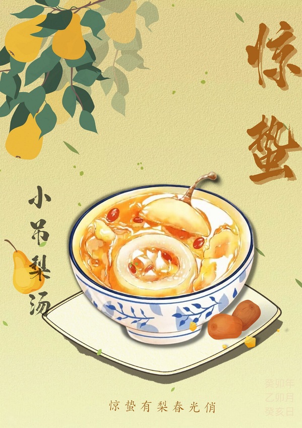 惊蛰时节,乍暖还寒,除了注意防寒保暖,还因气候比较干燥,很容易使人口干舌燥、外感咳嗽。因此,作品以民间惊蛰吃梨的习俗为设计理念,寓意“顺顺梨梨”。