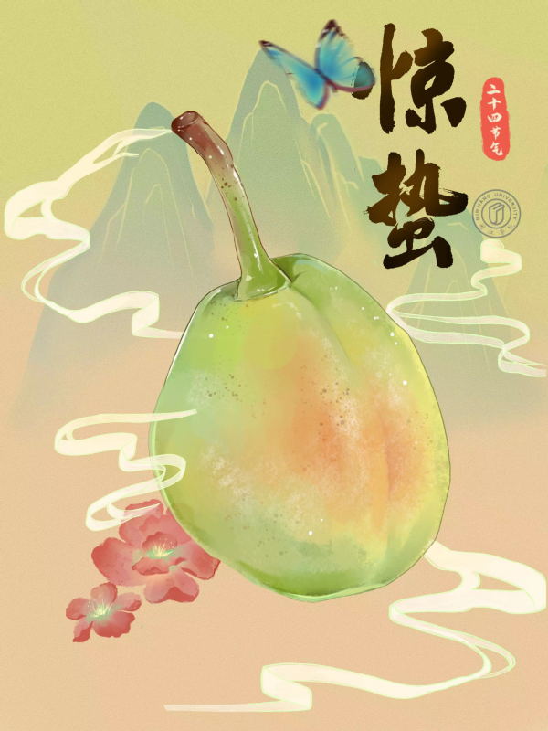 惊蛰时节,春气萌动,大自然有了新的活力。惊蛰这一天正是万物苏醒的时候,惊蛰时节也有吃梨的习俗。梨和“离”谐音,也寓意着病痛远离身体。作品以梨为主体花朵昆虫为点缀体现了惊蛰时节。