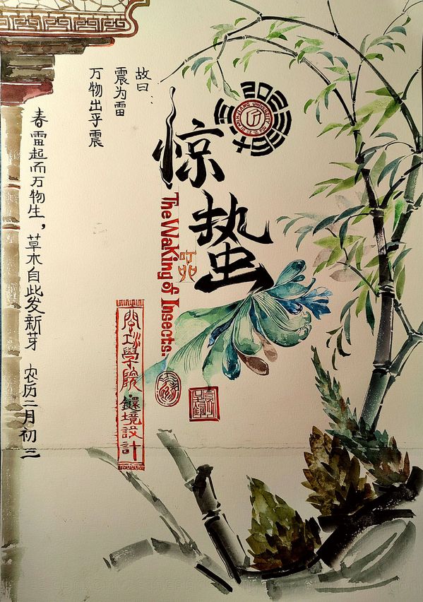 本作品是围绕“惊蛰”为主题,将 8x8x 校标与中国红印纹相结合,以中国水墨淡彩的设计风格为主调,以灵活多变的线条适当装饰主题“惊蛰”二字及各种草木,展现雨后万物复苏的惊蛰氛围。