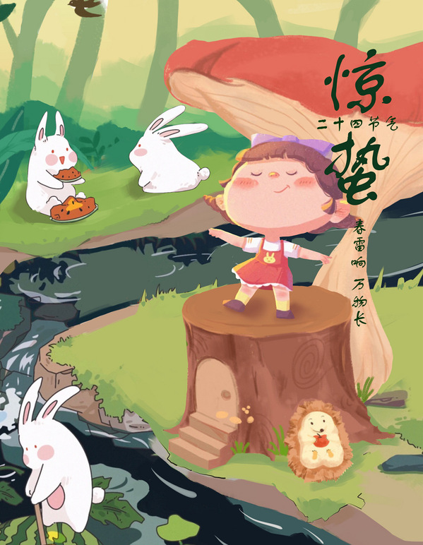 惊蛰,又名“启蛰”,是二十四节气中的第三个节气。时至惊蛰,阳气上升、气温回暖、春雷乍动、雨水增多,万物生机盎然,作品将惊蛰的景象用艺术手法在海报中进行描绘体现,展现惊蛰时节。