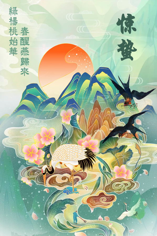 惊蛰是二十四节气中的第三个节气。惊蛰至,春醒燕归来。惊蛰分三候,一候桃始华,二候仓庚鸣,三候鹰化鸠。作品运用了桃花和燕子衔枝来作为灵感,展现惊蛰节气。