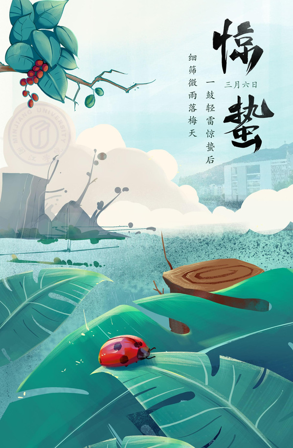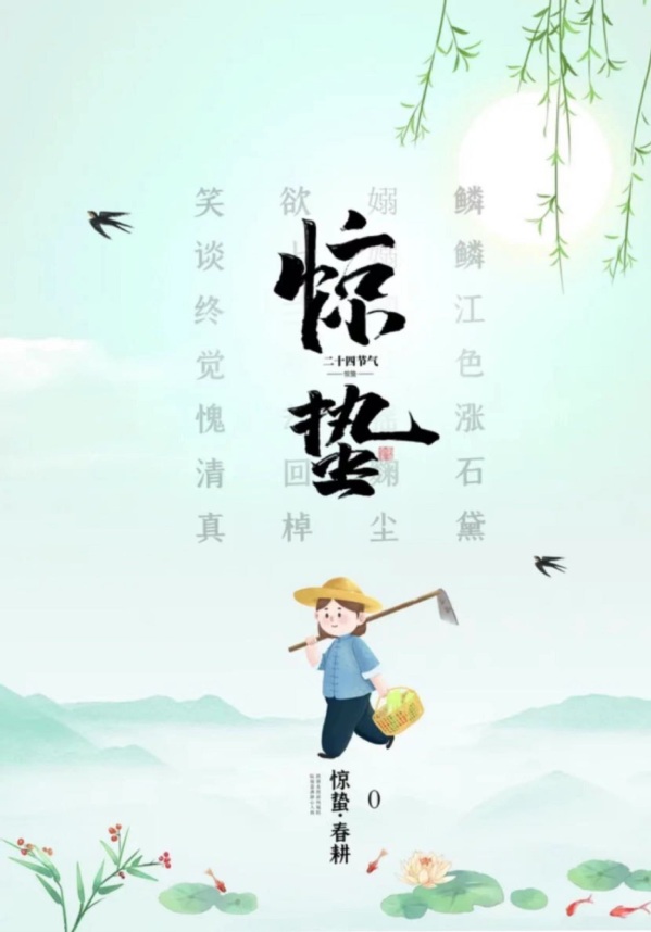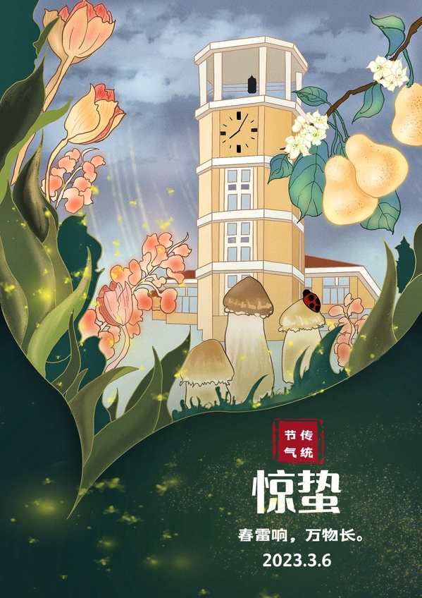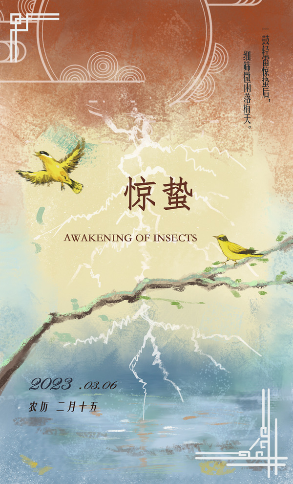 惊蛰,古称“启蛰”,是二十四节气中的第三个节气,标志着仲春时节的开始。《月令·七十二候集解》解释:“万物出乎震,震为雷,故曰‘惊蛰’,是蛰虫惊而出走矣。”此前,动物入冬藏伏土中,不饮不食,是为“蛰”;到了仲春,天上的春雷惊醒蛰居的动物,称为“惊”。我国古代将惊蛰分为三候:“一候桃始华;二候仓庚(黄莺)鸣;三候鹰化为鸠。”描述已是桃花红、李花白,黄莺鸣叫、燕飞来的时节。自此以后,气温回升较快,春意渐渐浓厚,万物开始复苏,而春耕也即将开始。值此惊蛰时节, 8x8x 社团管理中心组织同学们共同创作了“我们的节日·惊蛰”系列海报,为这个特殊的节气又增添了一丝艺术气息。