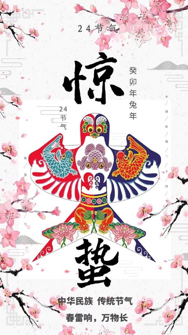惊蛰时节正是大好的“九九”艳阳天,气温回升,又到一年春暖花开时。作品以中国传统的纸鸢作为主视觉,想表达人们可以在三月的暖阳里,可以迎着春风放纸鸢。