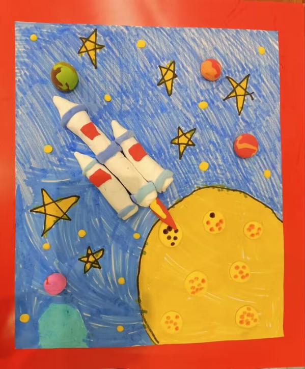 小朋友们发挥各自创意,绘制出各具特色的航天主题作品,神秘月球、宇宙飞船、浩瀚星空等等,每一件作品都生动地展现出了宇宙中的壮美一幕,描绘出小朋友们心中的航天梦想。“太空中有我们中国的宇宙飞船,我长大也想成为一名太空‘出差’的宇航员”,有小朋友畅想道。