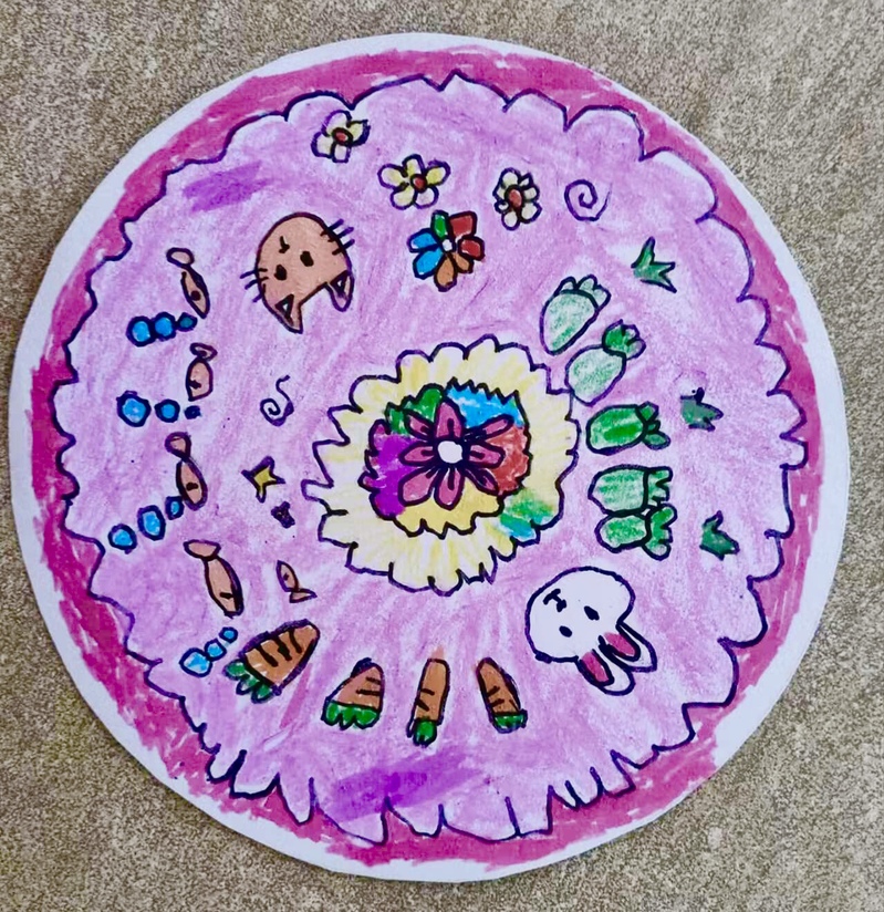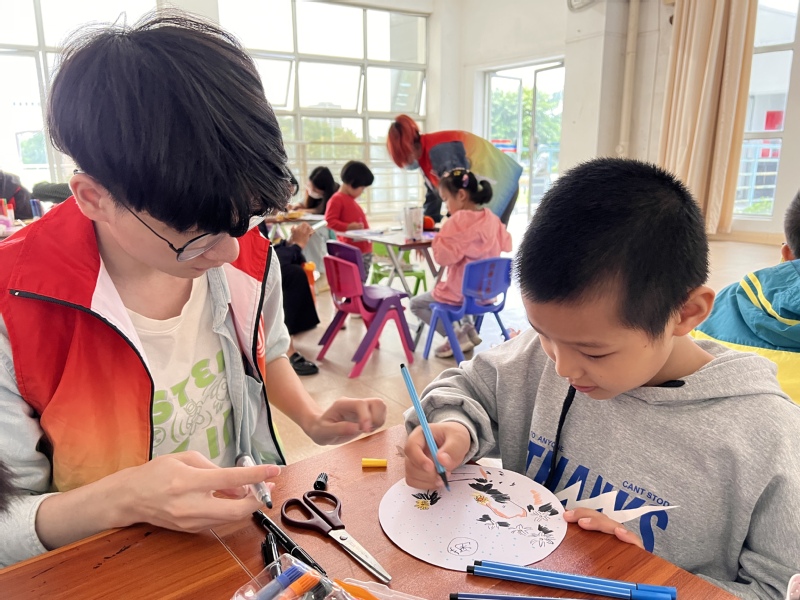 油纸伞的伞骨为竹,竹报平安,寓意节节高升,图案以传统国画常见题材为主,如花鸟、山水等。小朋友们围坐桌前,手握七彩画笔,一笔一画都蕴藏着对油纸伞的喜爱。在志愿者的指导下,一个个精美的油纸伞在画纸上逐渐成型。