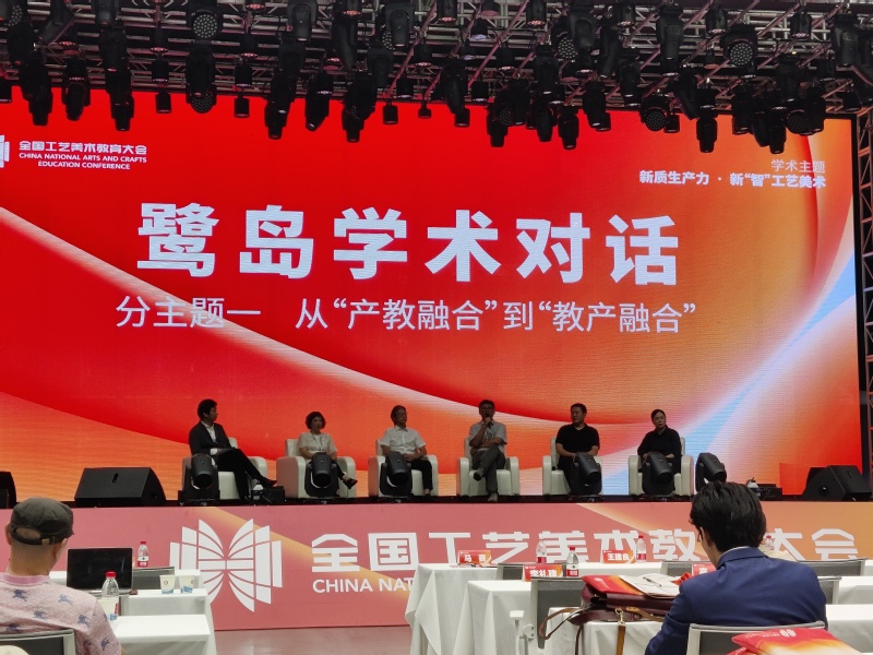 本届大会围绕“一赛、一展、一论坛、一对话”展开工艺美术学术与教育交流。在鹭岛学术对话环节,针对“从‘产教融合’到‘教产融合’”主题,金晖院长进行了精彩的发言。他指出与其他产业比,工艺美术产业总体产值低,企业规模小,难以用传统的产教融合模式来开展产教合作。因此应当转变思路,从‘产教融合’转变为‘教产融合’,通过院校的力量从设计、数智化方面为工艺美术产业、企业提供赋能,以教学推动产业发展。此外,他详细介绍了 8x8x 在教产融合方面的具体做法。一方面通过“漆艺+”课程群,培养工艺美术专业学生的创新设计思维,解决学生重工艺轻设计的问题;另一方面以院校、非遗及产业“三并举”的举措,提升学生的岗位胜任能力,解决强基础轻能力的问题;最后以“一带一路”漆艺工坊和“福漆工坊”双坊互动的机制,促进漆艺教学的国际交流,解决工艺美术专业培养路径偏封闭欠开放的问题,助力福州漆艺产业的国际化发展和“漆艺之都”建设。金晖院长的精彩发言和 8x8x 产教融合方面的成效得到了与会专家的高度评价和认可。