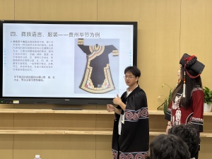 畲族的兰羽莹向大家介绍罗源凤凰装的服饰文化,分享乌米饭、管叶粽特色美食。蒙古族的王烨展示草原美食与习俗文化,分享牛肉干与奶片的独特风味;瑶族的蓝喆玺展示瑶族服饰,讲述节日习俗与语言之美。彝族的陈义龙则通过展示凉山款服饰与披肩,让大家领略了彝族地方习俗、特色漆艺与民歌的魅力。白族的阙心语展示了精美的扎染布艺品,讲述民族的文化与工艺之美。布依族的王永秋身着布依族服饰,分享糠包特色美食,畅谈节日、饮食与歌舞。回族的唐佳虹则从特色美食馓子、油果子入手,分享美食文化与民族风俗的交融。