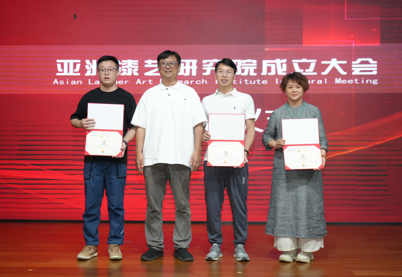 Jaran Maluleem副校长、王长明理事长、金晖院长、林毓芝院长、侯立斌副院长、小椋範彦教授、Vincent Cazeneuve教授、Phumrapee教授、刘雪山秘书长,共同为亚洲漆艺研究院揭牌,并为研究院首届理事会领导成员颁发聘书。