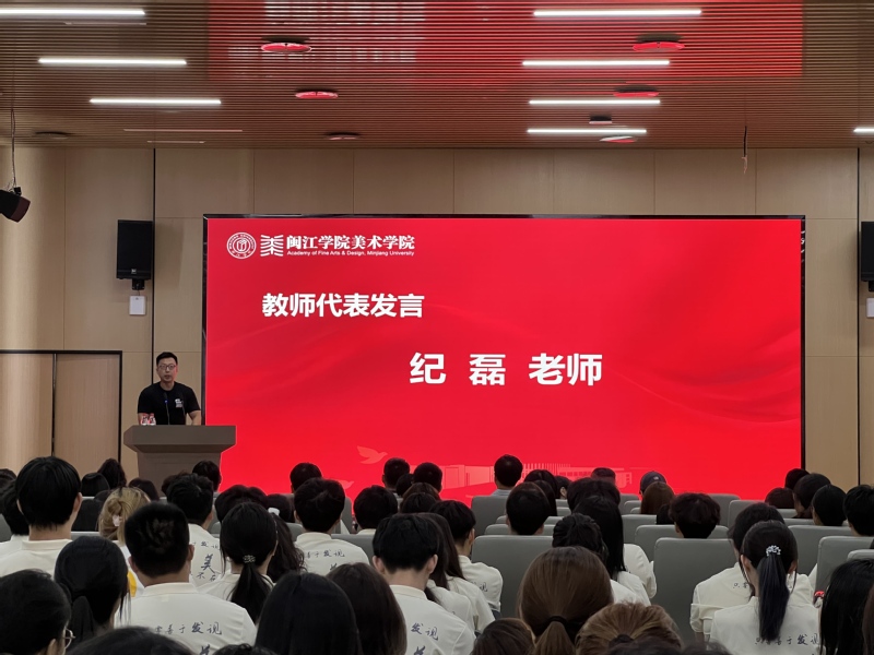 视觉传达系主任纪磊老师作为教师代表发言。他结合自身求学与工作经历,向新生提出三点学习的建议:一是扎实基础。苦练基本功,认真对待课堂与画室训练,为创作打下坚实根基。二是观察生活。多走多看,把真实体验转化为作品最动人的部分。三是勇于实验。打破标准,敢于尝试新材料、新形式,学院和老师会全力支持同学们的探索。最后,他以“未来是你们的”鼓励同学们勇于创作,创造美好的未来。