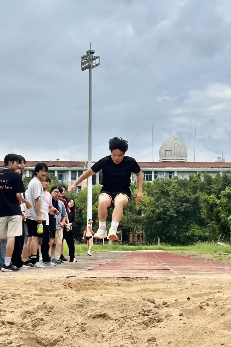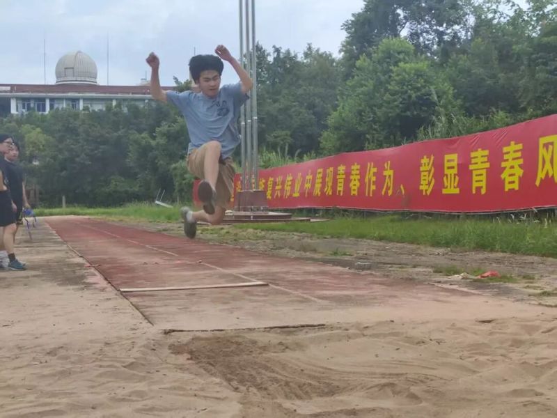 跳远运动员们助力蹬地,腾跃掠空,落地时沙粒飞溅,定格出力量与轻盈的完美弧线。