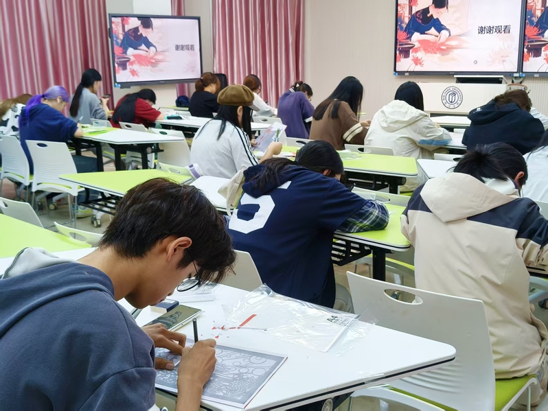 宣讲结束,剪纸活动正式开始,同学们纷纷拿起工具,沉醉于纸尖创作之中,同学们每一道线条的勾勒、每一处镂空的雕琢,既是对剪纸技艺的实践传承,更是将家国情怀融入方寸作品的生动过程。